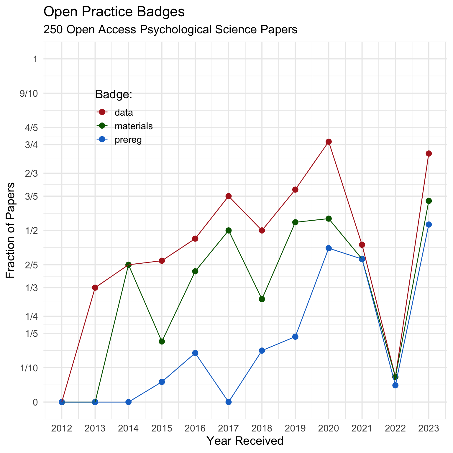 Calculate the fraction of papers each year with open data, materials and preregistration.