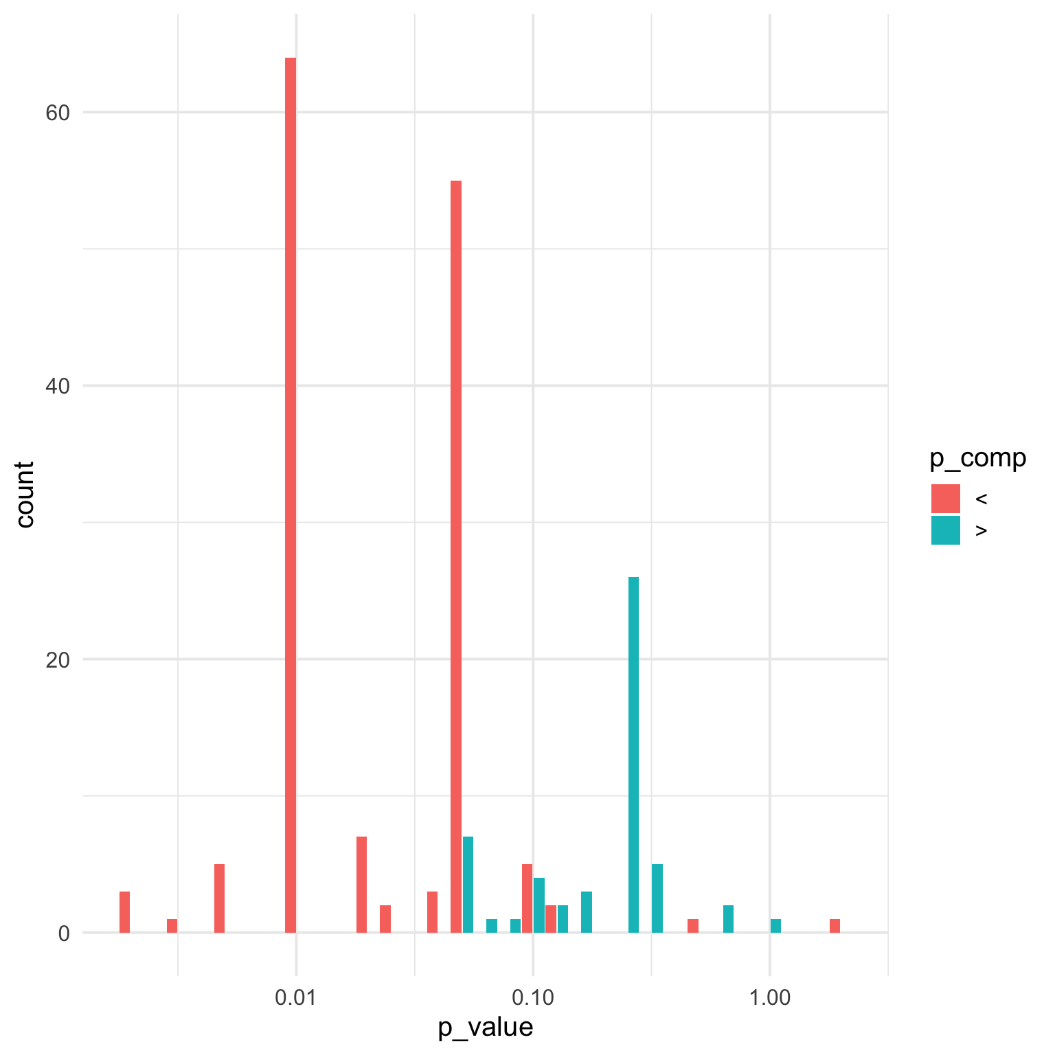 P-values in research are definitely not uniformly distributed, so let’s give this a log10 scale, change the binwidth to 0.1, and dodge the bars.