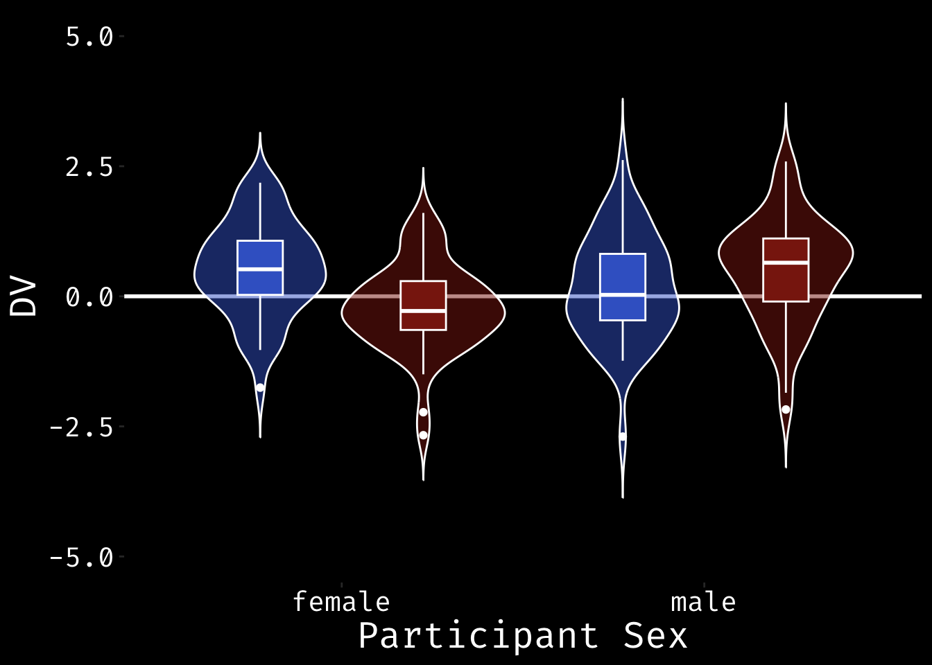 }Once you’ve defined the new geom, you can use geom_split_violin pretty much like geom_violin. Note how the position of the geom_boxplot changes to put the boxplots side-by-side.