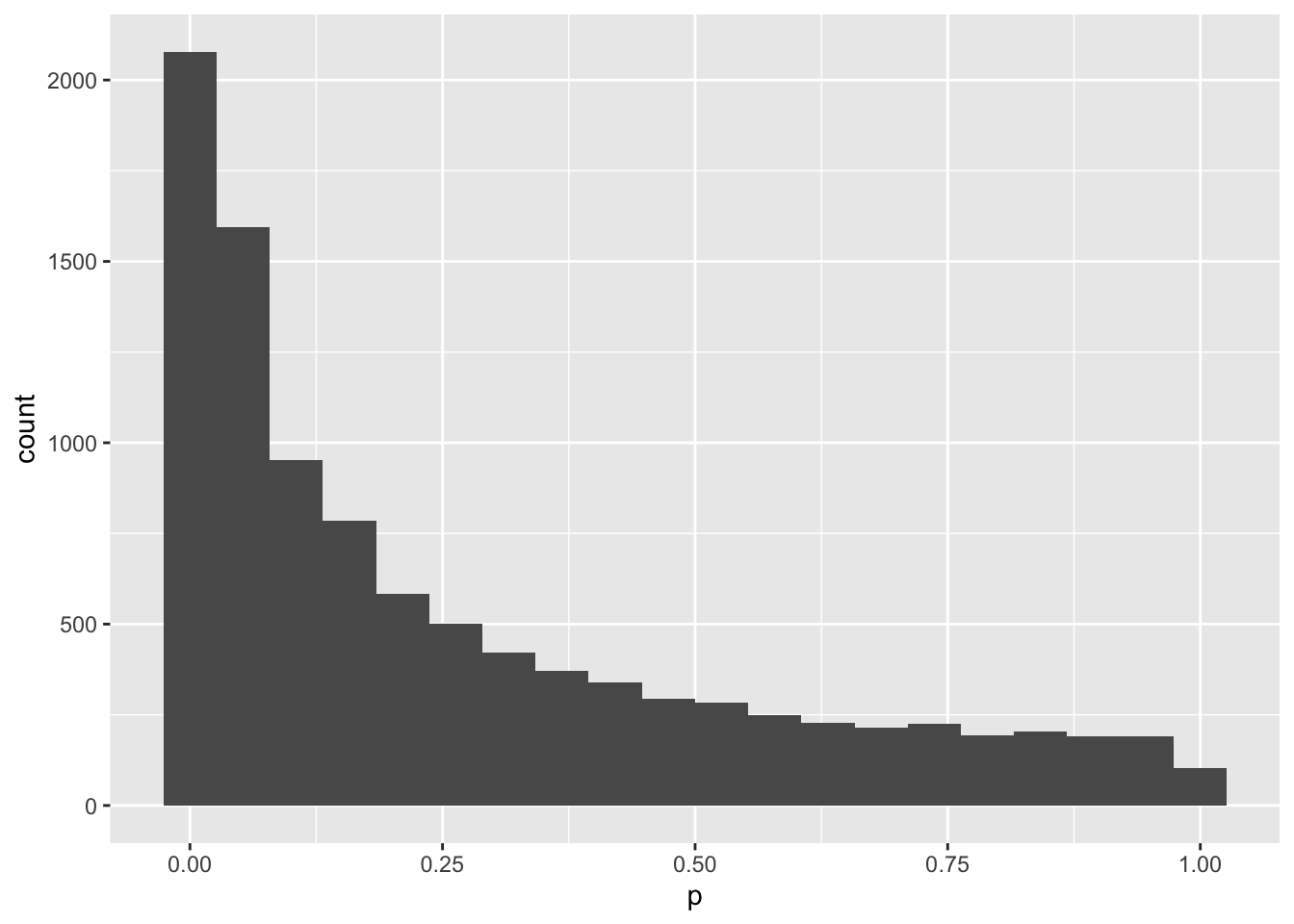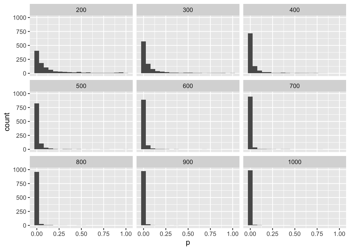 Hmm, you only get a p-value less than .05 30% of the time. That means that your study would only have 30% power to detect an effect this big with 100 subjects. Let’s make a new function to give you the p-value of a study with any number of subjects (you put the N inside the parentheses of the function).
