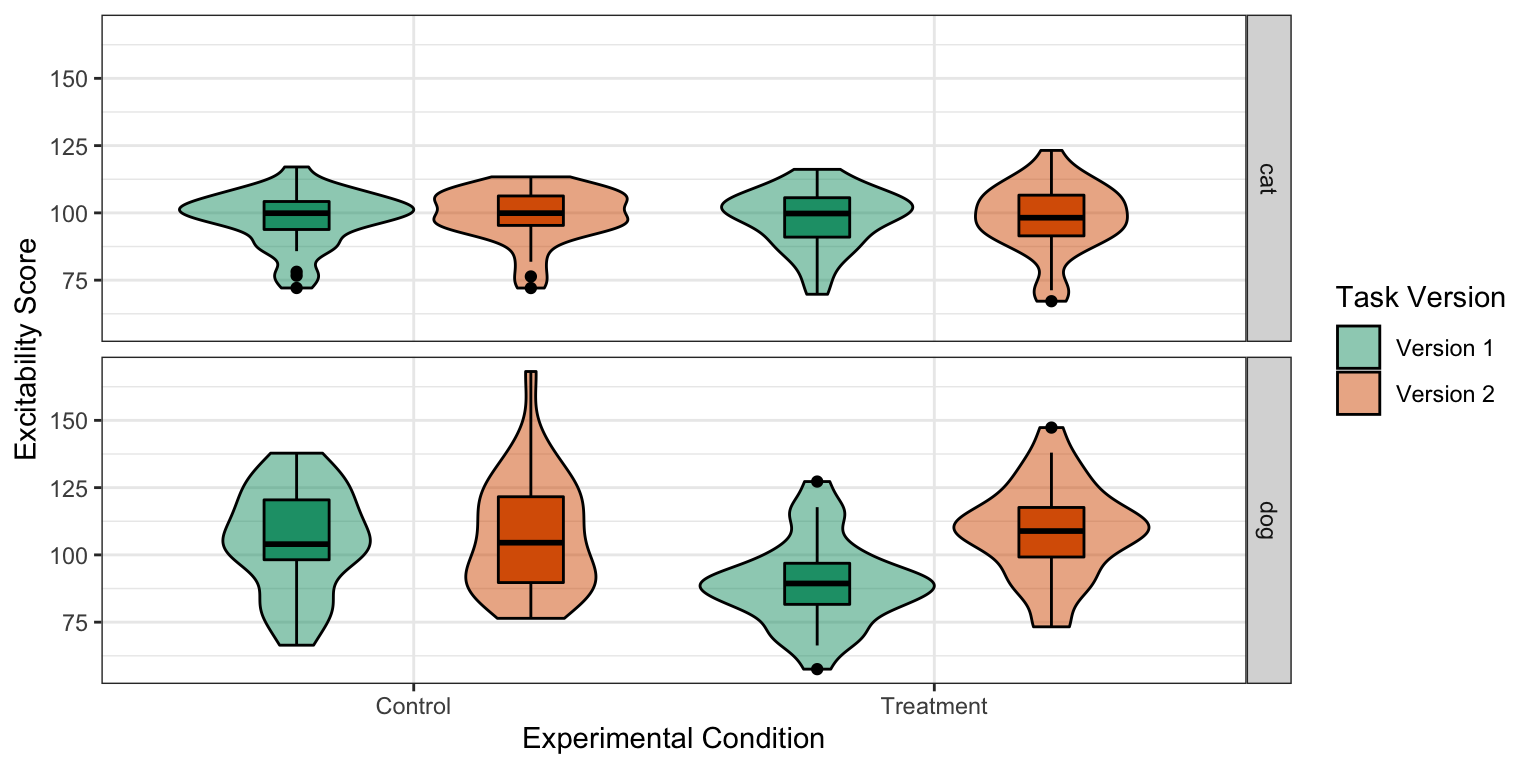 dfA <-filter(df, group =="A")analysisA <-t.test(dv~condition, data = dfA)dfB <-filter(df, group =="B")analysisB <-t.test(dv~condition, data = dfB)