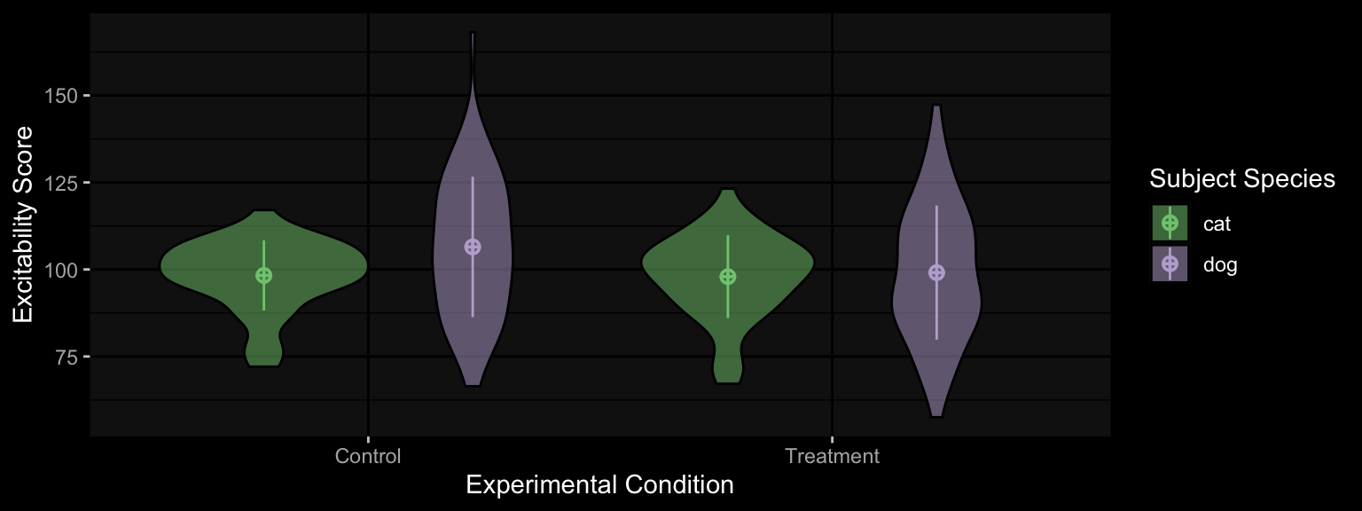 library(testthat)# check the data has the expected number of rowsexpect_equal(object =nrow(sim_data), expected =240)# check that a column is a factor with the expected levelsexpect_equivalent(object =levels(sim_data$species), expected =c("cat", "dog", "ferret"))